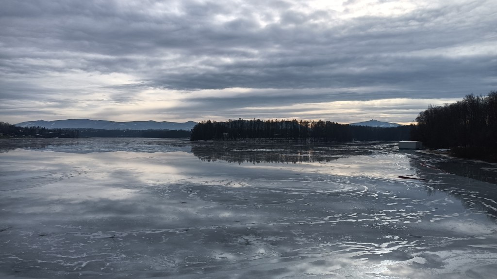 The final weekend of the month, I went for a walk in the suburbs rather than a full-scale hike. This limited some more charming view, but the paper-thin sheet of ice in the reservoir lake did lead to an interesting view with the mountains in the distance reflecting on the surface.
